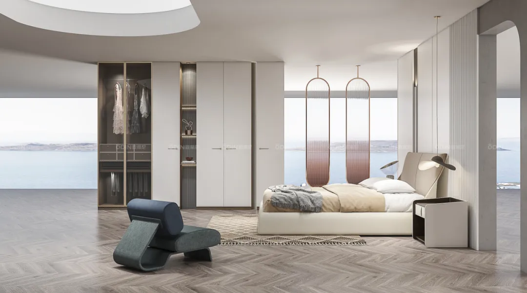 - 空間最大化:去除傳統(tǒng)衣柜頂部的積灰空間,一門到頂?shù)脑O(shè)計(jì)不僅增加了儲物容量,還使整體線條更加流暢,視覺上拉長空間高度,顯得房間更加開闊。