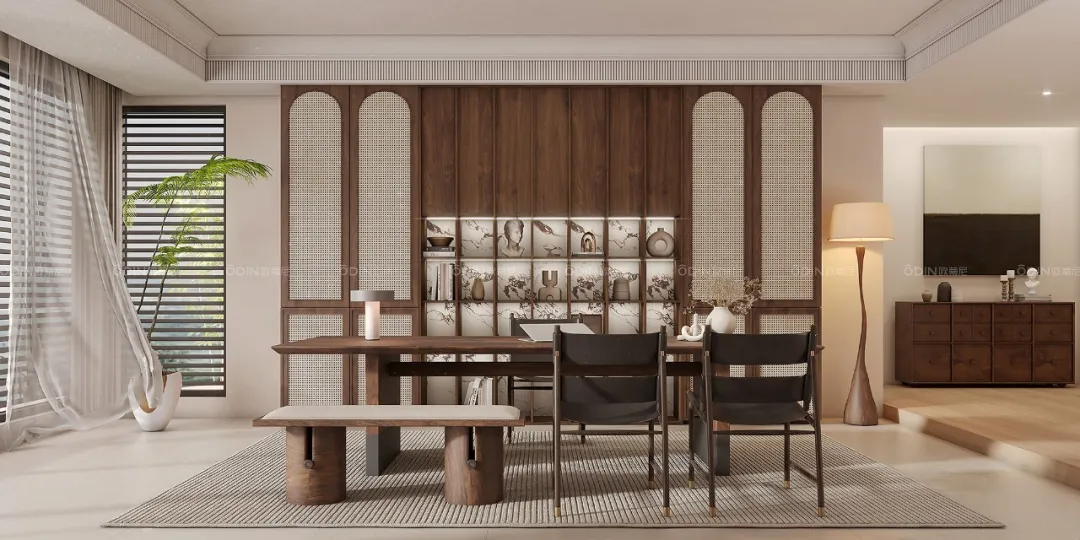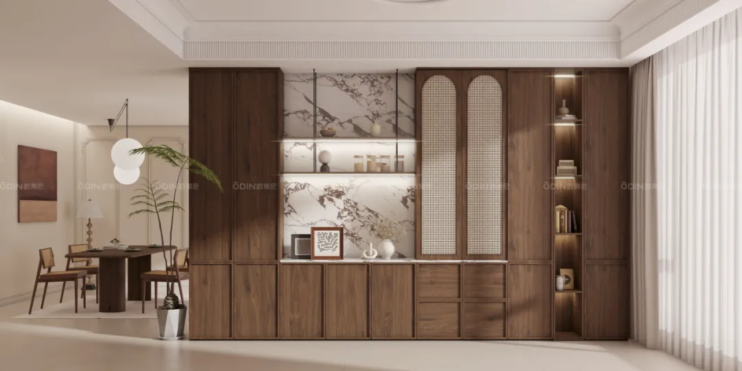 搭配經典胡桃色,讓柜體的色彩沉穩而不失高級。胡桃色的溫暖與復古,與藤編元素的自然古樸相得益彰,營造出濃厚的復古氛圍。無論是放在客廳、餐廳還是書房,都能成為一道亮麗的風景線。